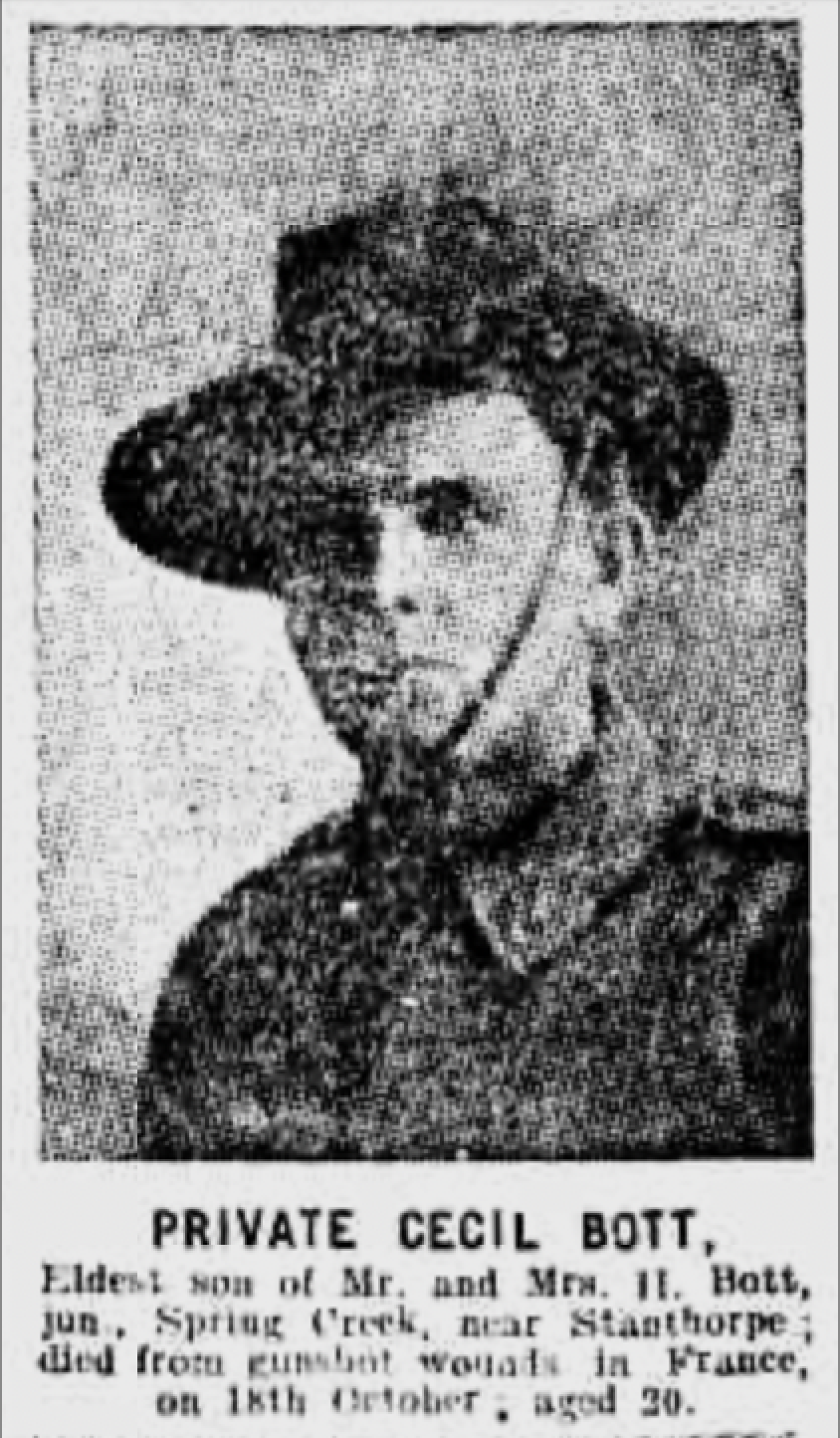 News was received on Wednesday morning that Private Cecil Bott had paid the supreme sacrifice at the front. The Rev. D. Fletcher went out to the home of the deceased’s parents at Spring Creek. Private Cecil Bott was the eldest son of Mr. and Mrs. H. Bott Jnr., of Spring Creek, and when he enlisted last year he could not have been more than 18 years of age. He was a fine strong lad, and to think that his young life has been cut short in the defence of his country in distant lands is very sad indeed. He was a native of Stanthorpe and the greatest sympathy will be felt for his parents and other relatives.